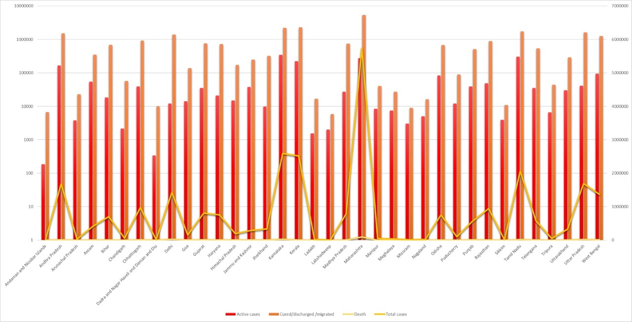 | Number of cases | The total number of confirmed cases as of May 31, 2021 is 28,047,534, of which 2,026,092 were active cases. The number of recovered cases is 25,692,342, which includes cumulative cured/discharges/migrated cases, and the total number of deaths in India due to COVID-19 is 329,100. The highest number of COVID-19 cases to date is recorded in Maharashtra with 5,731,815 (6). |
