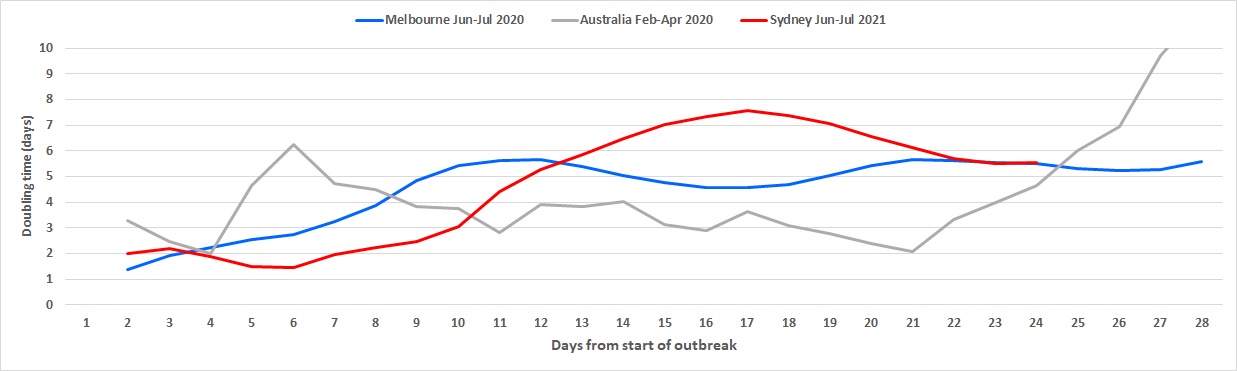 Doubling times for Sydney’s outbreak up to present time, as compared to the doubling times of the country’s first wave (grey) and Melbourne’s outbreak in 2020 (blue).