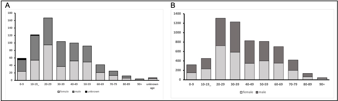 (A) Analysis of gender and age groups in current outbreak (June 16 to July 13, 2021), as compared to (B) all confirmed cases since 2020.