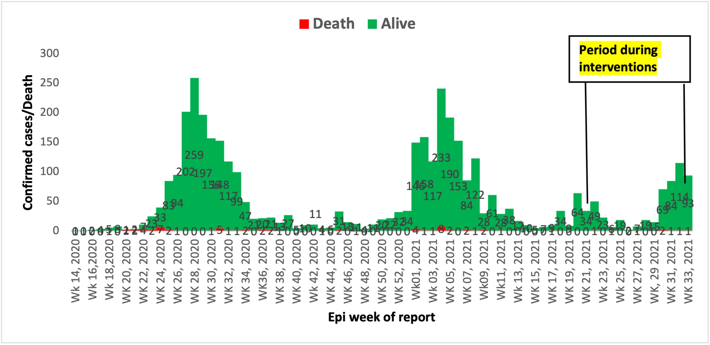 Figure 1 shows the epidemic curve of the outbreak from epi-week 14 (3rd April), 2020 to epi-week 33 (22nd August), 2021. The curve shows four waves of the COVID-19 outbreak since the report of the index case on April 3, 2020, with peak of cases on 12 July during epi-week 28 of 2020 (259 cases), 31 January 2021 (233 cases), 23 May 2021 (64 cases) and 12 September 2021 (114 cases) respectively.