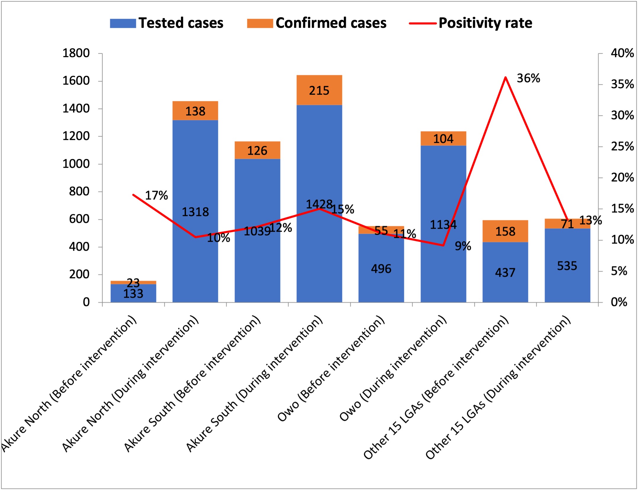 Generally, 3880 suspected cases were tested and 456 cases were confirmed for COVID-19 during 3 months of integration of sample collection into healthcare services at the facility level in the three hotspot LGAs compared to 1668 samples tested and 204 cases confirmed in three months before the intervention. Specifically, 1451 (During: 1318 vs before: 133) samples were tested in Akure North, 2467 (During:1428 vs before: 1039) in Akure South and 1630 (during 1134 vs before: 496) in Owo LGA respectively (Figure 2). There was a reduction in test positivity rate in Akure North and Owo LGAs in the period during the intervention (Akure North; 10% and Owo; 9%) compared to the period prior to intervention (Akure North; 17% and Owo; 11%)