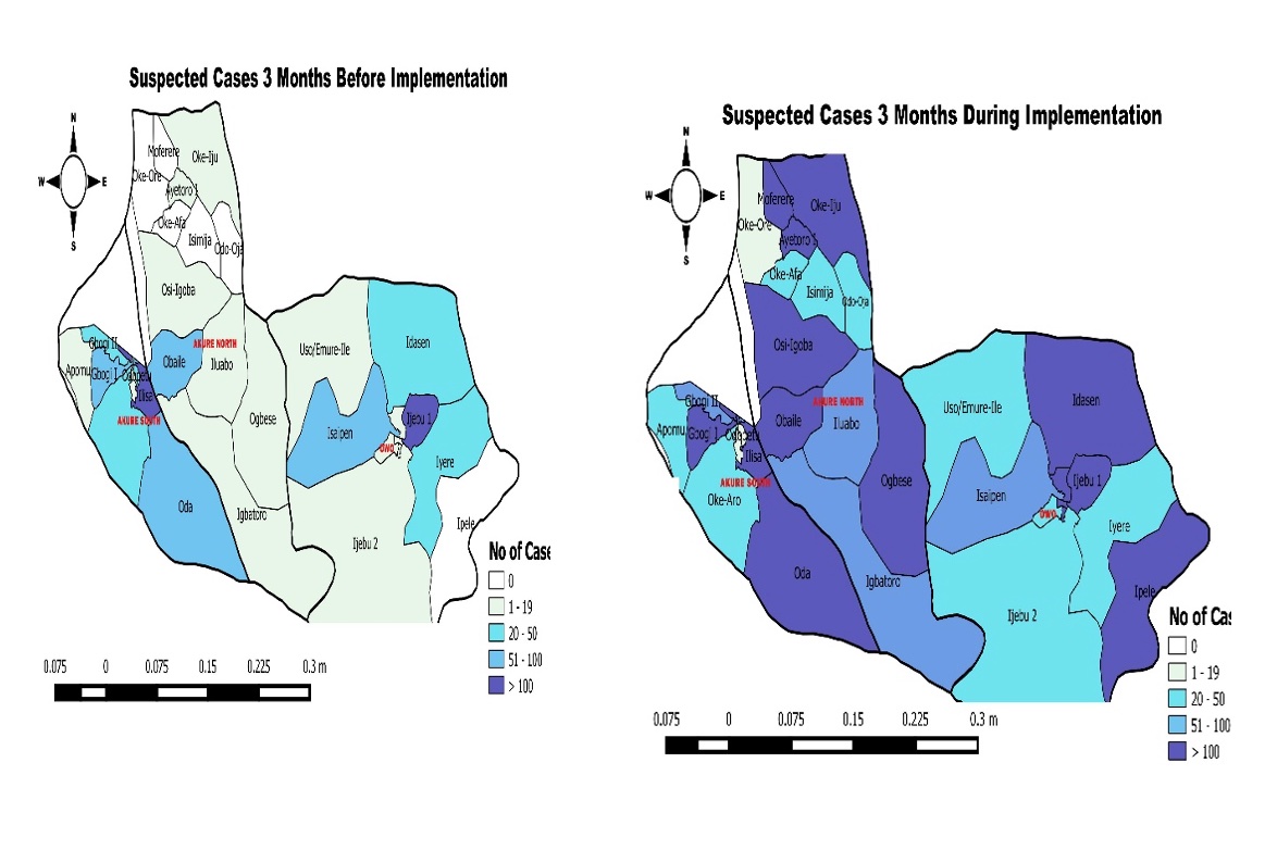 Comparison between COVID-19 suspected cases by wards before and during intervention in 34 wards in the three hot spot LGAs, Ondo State