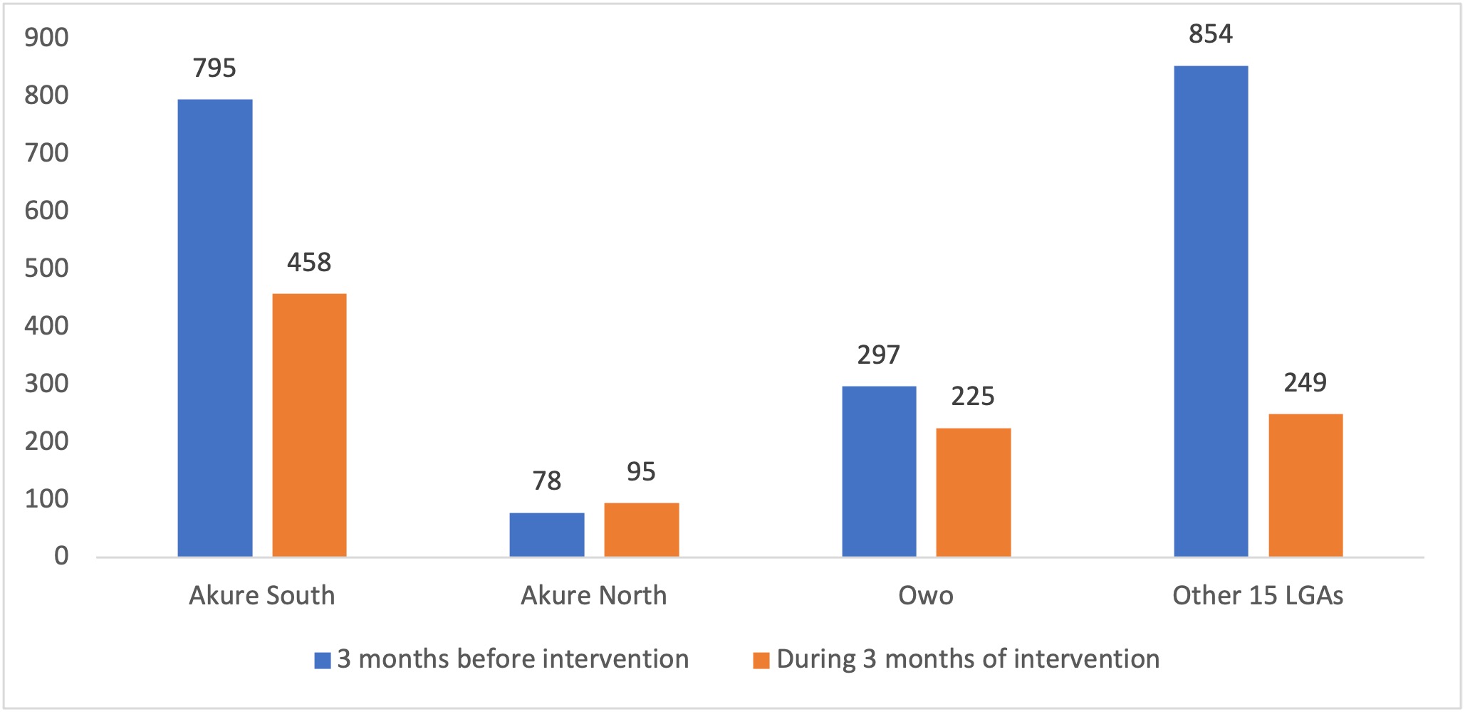 In Figure 4, the number of contacts traced and line-listed during the period of intervention compared to the period before intervention was lower for both Akure South (458 vs 795) and Owo LGAs (225 vs 297) respectively. However, slightly higher number of contacts were line listed during the intervention periods (95) compared to periods before intervention (78) in Akure North LGA. Generally, the case to contacts ratio dropped from 1:5 before intervention to 1:1 during the interventions in the three hot spot LGAs.