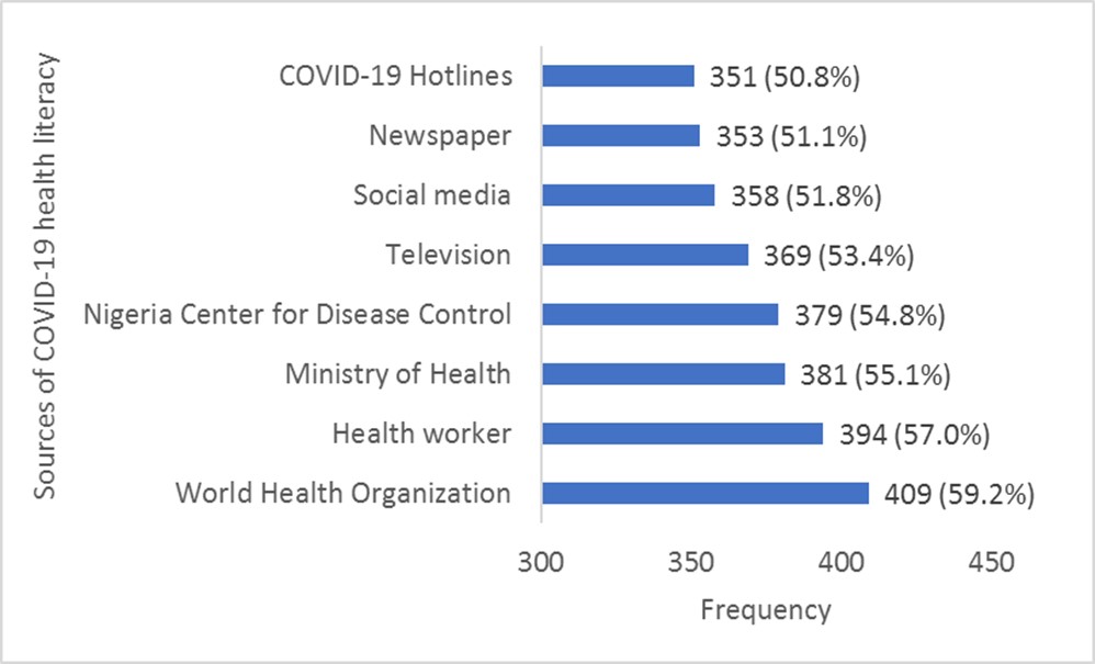 Figure 1 describes the sources of COVID-19 health literacy among community members in Ondo State, Nigeria. Among the respondents, 409 (59.2%) obtained COVID-19 information from the WHO, 394 (57.0%) got COVID-19 information from health workers, 381 (55.1%) obtained COVID-19 information from the Ministry of Health.
