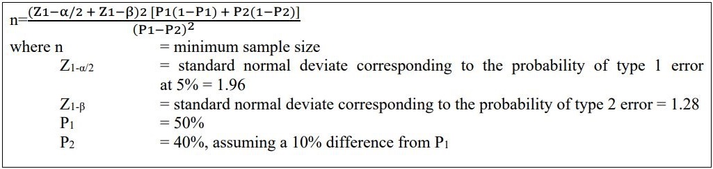 The sample size was calculated for this study using the sample size for comparing two proportions (Box 1) [14]. The minimum estimated sample size was 514. As the households in the communities existed in clusters, a design effect of 1.5 was used to increase the sample size. Thus, the calculated sample size for the study equaled 771.