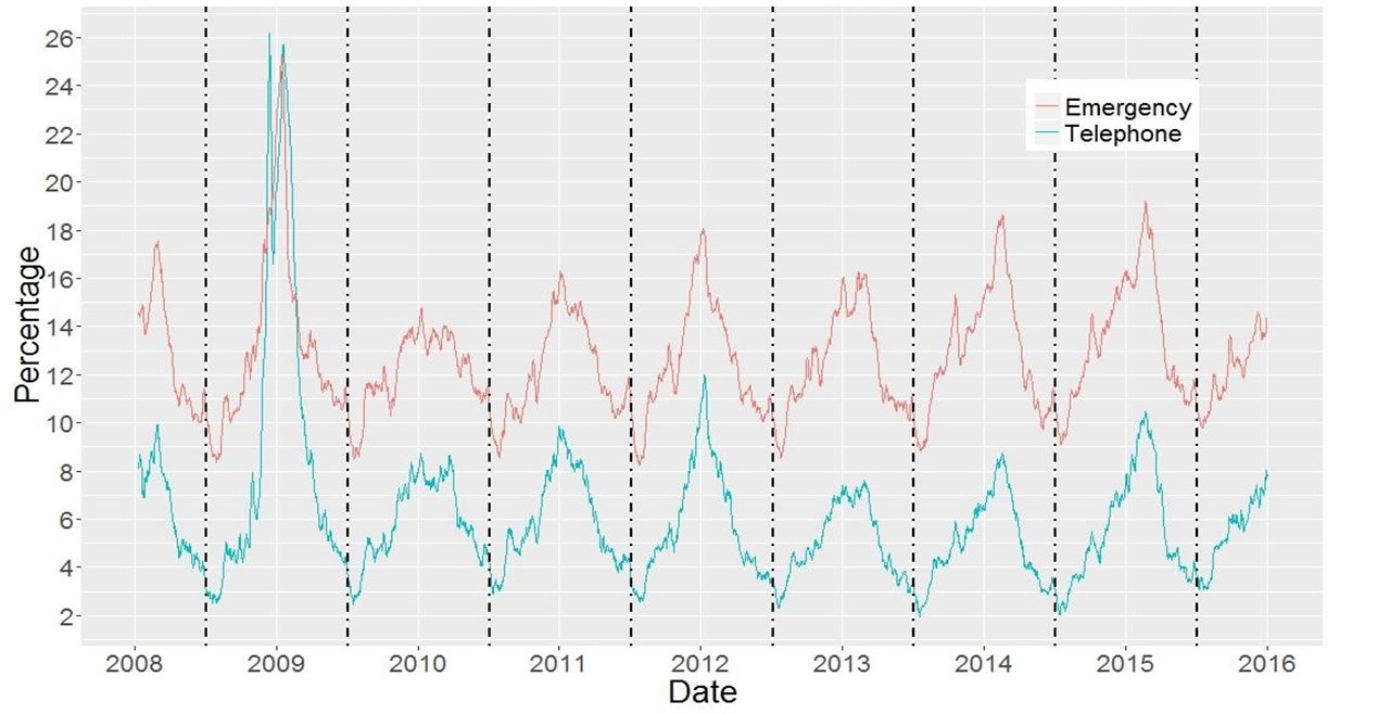 The red line shows ILI-related visits to an NSW Emergency department, as a percentage of all visits in New South Wales from 2008 – 2016. The blue line shows ILI-related calls as a percentage of all calls to the HH in Australia from 2008 – 2016.