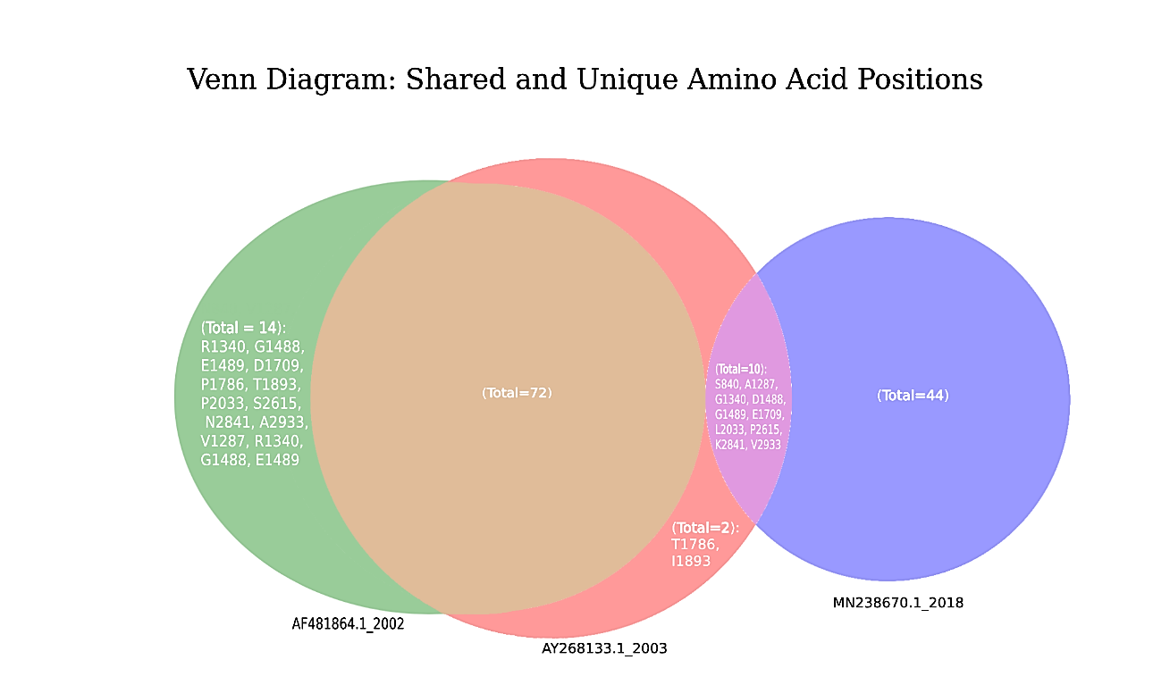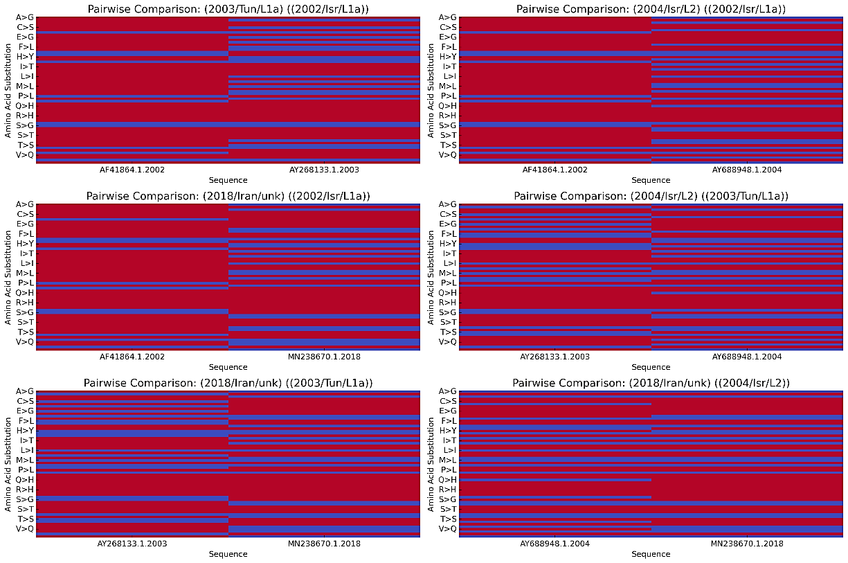 A high similarity was observed between the Iraq 2018 strain and the Lineage 2 sequence compared to the Israel 2002 reference sequence, with critical substitutions identified at the following positions: NS1 (K874A, E917N, K964E, R1028G, Q1172R); NS2 (H1297Y, L1301S, R1340G, G1488D, E1489G); NS3 (Q1629H, P1786H, T1973E); NS4 (Q2324H); and NS5 (Q2579H, K2700A, R2758H, N2841, E2859V, E2859A, H3011N, G3366K), all of severe impact which indicates a potential changes in viral function that may affect its pathogenicity or immune evasion. A Venn diagram was also made (Figure 5) to highlight the strains' shared and unique amino acid positions. Among three WNV sequences, Israel 2002 (AF481864.1), Tunisia 2003 (AY268133.1), and Iran 2018 (MN238670.1). Among these, 10 were shared between (AF481864.1) and (AY268133.1). 14 positions were unique to (AF481864.1), 2 were unique to (AY268133.1), and 44 were unique to (MN238670.1). The 2018 Iran strain exhibited the highest unique amino acid positions, suggesting it has undergone more recent evolutionary changes. As it shows, the similarities in amino acid sequences outweigh the differences, indicating a high degree of conservation at the protein level. Next, a pairwise comparison of amino acid substitutions was performed using R programming between the current sequences, analyzing two at a time (Figure 6); the X-axis represents the specific viral sequences being compared, and the Y-axis displays the amino acid substitutions observed between the sequences, with each letter pair indicating the original and substituted amino acids. Additionally, the colors illustrate the level of similarity or divergence between the amino acid sequences being compared. The red bars indicate identical regions, meaning high similarity (no substitutions) at those positions, while the blue bars correspond to areas of amino acid substitution. This effectively differentiates conserved regions (red) and evolutionary change areas (blue). Thus, the Iran strain 2018 (MN238670.1) appears to be more closely related to Lineage 1a and shows distinct differences from both lineages.