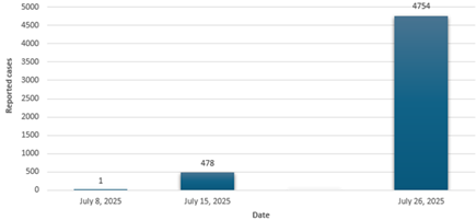 Number of cases (specify at what date if ongoing) There were limited data available documenting daily case numbers during the outbreak. An epidemic curve illustrating the precise incidence rate of the outbreak could not be produced due to limitations in data availability. However, publicly available sources indicated an unusual feature of the outbreak, characterised by a rapid increase in case numbers within one month (Figure 2). Since the first importation occurred on July 8, 2025, in Foshan City, Guangdong Province, the total reported cases had reached 478, and by July 26, this number had risen to 4,754 (Figure 2) (7,10,11).