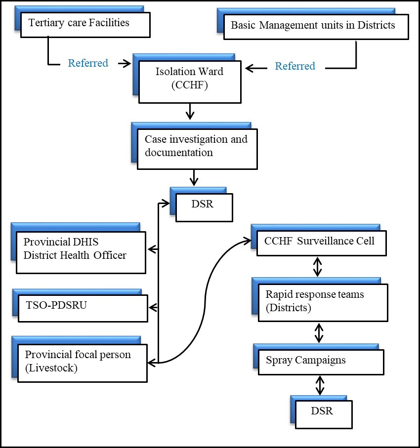 (CCHF- Crimean Congo Haemorrhagic Fever, DSR - Daily situation report, DHIS- District health information software, TSO- Technical Support Officer, PDSRU- Provincial Disease Surveillance & Response Unit)