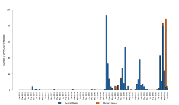 Figure 2: Temporal Trends of EPIWATCH® Reports of Avian Influenza virus outbreaks in animals and humans in India (January 2020 - July 2024).