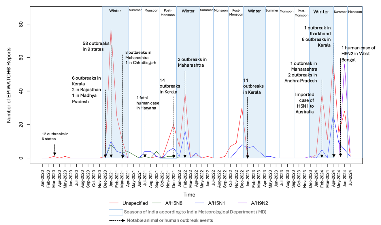 Methods: Animal and human outbreak data of avian influenza strains in India were extracted from EPIWATCH® from 1st January 2016 to 31st July 2024. A time series analysis of EPIWATCH® reports was conducted to investigate the temporal trend of avian influenza in India. To investigate the usefulness of EPIWATCH®, reports from EPIWATCH® were also compared with the animal outbreak data from EMPRES-i+. Geospatial analysis was performed to visualise the temporal trend of hotspots of infection.