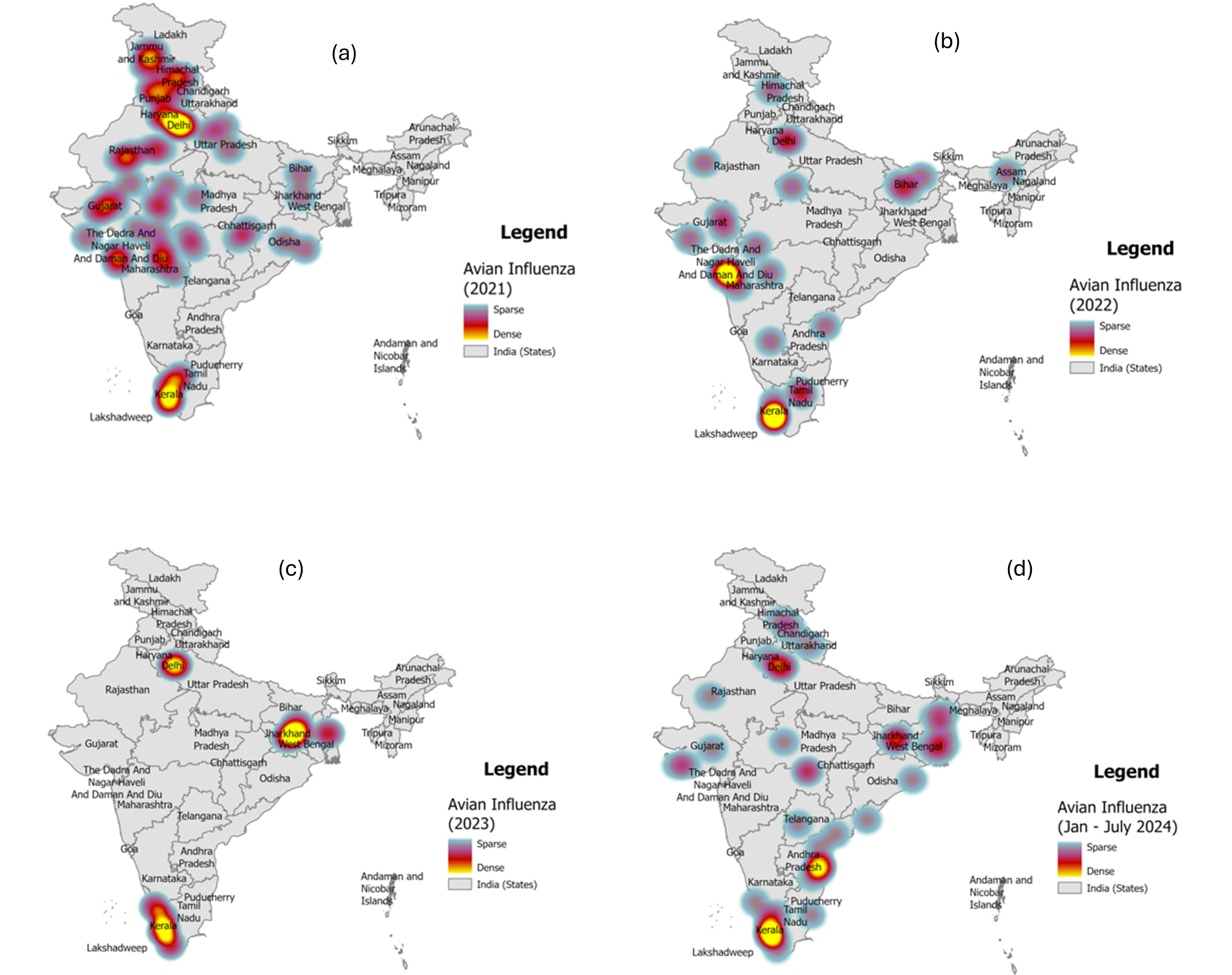 Figure 4 depicts the changing distribution of avian influenza outbreaks in animals and humans in India over the years between January 2021 and July 2024 from EPIWATCH®. As the number of EPIWATCH® reports was low between 2016 and 2020 (only 1-5 reports per year), these years are excluded in the analysis. Andhra Pradesh, Delhi, Jharkhand and Maharashtra are found to be hotspots with high density of EPIWATCH® reports in the period of January 2021 to July 2024. Kerala was continuously found to be a hotspot of EPIWATCH® reports from January 2021 to July 2024 whereas Maharashtra showed a high density of signals only in 2021 and 2022. Delhi has had a high density of EPIWATCH® reports for 2021 and 2023, while Jharkhand hosted for only one year, 2023. Andhra Pradesh only triggered a few or no reports from 2016 to 2023 and emerged as the state with high density of reports in 2024.
