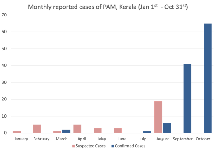 Critical analysis Data from the Integrated Disease Surveillance Programme (IDSP), managed by Kerala’s Directorate of Health Services and the National Centre for Disease Control (NCDC), were used to show the number of suspected and confirmed cases of N fowleri in Kerala from January to October this year.