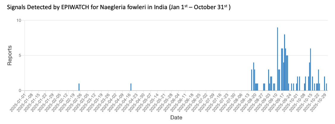 EPIWATCH® is an artificial intelligence-based early warning system established in 2016, facilitating the detection and monitoring of emerging outbreaks or infections ahead of formal surveillance reports by health authorities (29). Signals Detected by EPIWATCH® for N fowleri in India from January 1st - October 31st provides insight on the emerging outbreak of N fowleri in Kerala, as shown in figure 4. EPIWATCH® detected a signal for N fowleri in Kerala on the 24th of February, whilst the Health and Welfare Department of Kerala officially confirmed outbreaks on March 16th. Although not directly comparable to IDSP case data, the findings highlight that EPIWATCH® identified an emerging increase in infections in Kerala from September, with signals appearing approximately two weeks earlier, in mid-August. This pattern suggests that media attention intensified approximately 2 weeks before the clinical case peak, as observed in the IDSP data. The sustained high frequency of signals detected through September and October, with multiple reports per day, reflects the growing public awareness and concern about the outbreak (30). So far, no other international surveillance reports or health agencies, such as the WHO or the CDC, have reported on this ongoing outbreak in Kerala.
