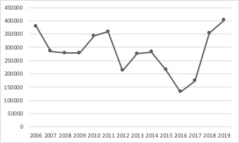 Comparison with past outbreaks | Globally, 2006 was the first year where <500,000 cases were reported since WHO monitoring was established (16). Since 2006 the 2017-2019 period has featured the highest upwards fluctuation of measles incidence recorded (Figure 1) (16).