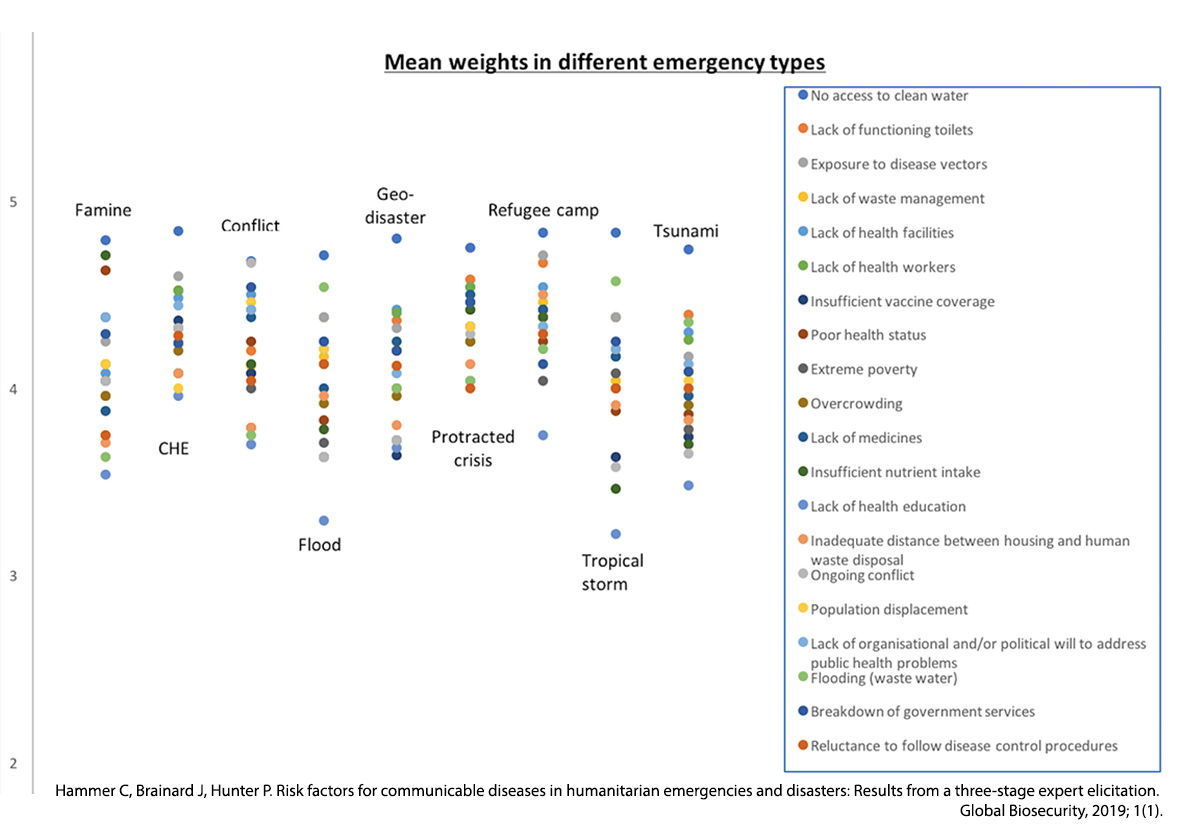The results from the first questionnaire, regarding the selection of risk factors, confirm that, as suggested in the wider literature, WASH (39-42), health care (36, 43), nutrition (1, 36, 37) and emergency specific risk factors such as poverty (44-46), displacement and overcrowding (1, 24, 28, 47), and (ongoing) armed conflict or war (48) are among the primary factors influencing communicable disease outbreaks in humanitarian emergencies and disasters. These results are further confirmed by the outcomes of the third questionnaire which indicates the high importance of the selected risk factors across all types of humanitarian emergencies. While some of the risk factors identified in this research were – deliberately – broad, additional discussion with humanitarian aid providers (which were not strictly speaking part of this research) revealed some of the most common interpretations of these risk factors and showed that, while encompassing a range of issues, they were interpreted similarly by all people we spoke to. For example, ‘breakdown of government services’ was generally interpreted as encompassing wider infrastructure issues such as transportation and roads, telecommunications, safety and security, and sometimes education. Many of these have complex interaction pathways (23).