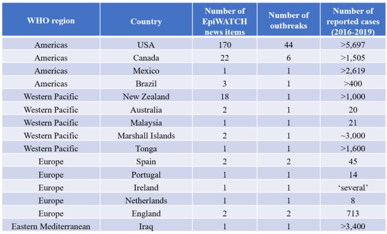 For the analysis, all reported cases were grouped according to geolocation and the date in which they occurred. A descriptive epidemiologic analysis was conducted using Microsoft Excel to identify the number of news items within EpiWATCH pertaining to each outbreak, the total number of reported cases, the length of each outbreak and the location of each outbreak (school, university, general community, etc). If the information was available, the vaccination status of the affected population, the public health response to the outbreak and links to other outbreak reports were also included. Public domain data from WHO (34) and the CDC (35) were used as comparators to EpiWATCH data to identify the strengths and weaknesses of the EpiWATCH system as a rapid intelligence surveillance tool.
