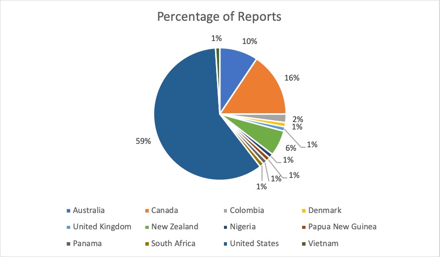 Country Percentage of Reports. Cumulative from 2016 to 2019.