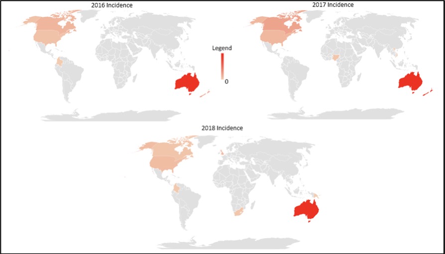 Notes: Annual Prevalence was based on population estimates for the given country for the year. In addition, some countries had reported case numbers in one year and did not have reported cases in another. As the legend indicates, the darker the hue of red, the higher the annual prevalence, but varying depending on the year. The following ranges of prevalence are reported below: For 2016, the prevalence ranges from 1.6 to 0.33 per 100,000. For 2017, the prevalence ranges from 28.7 to 0.02 per 100,000. For 2018, the prevalence ranges from 1.5 to 0.03 per 100,000. In 2019, the prevalence ranges from 22.5 to 0.01 per 100,000. The countries in grey data were not gathered for comparison.
