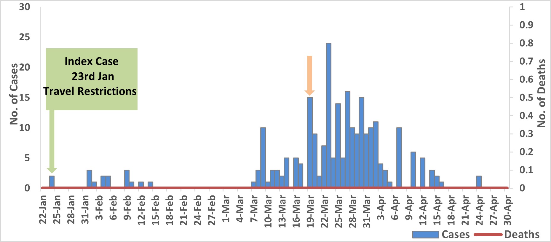 Trend of COVID-19 cases and deaths reported in Vietnam till 30th April 2020.