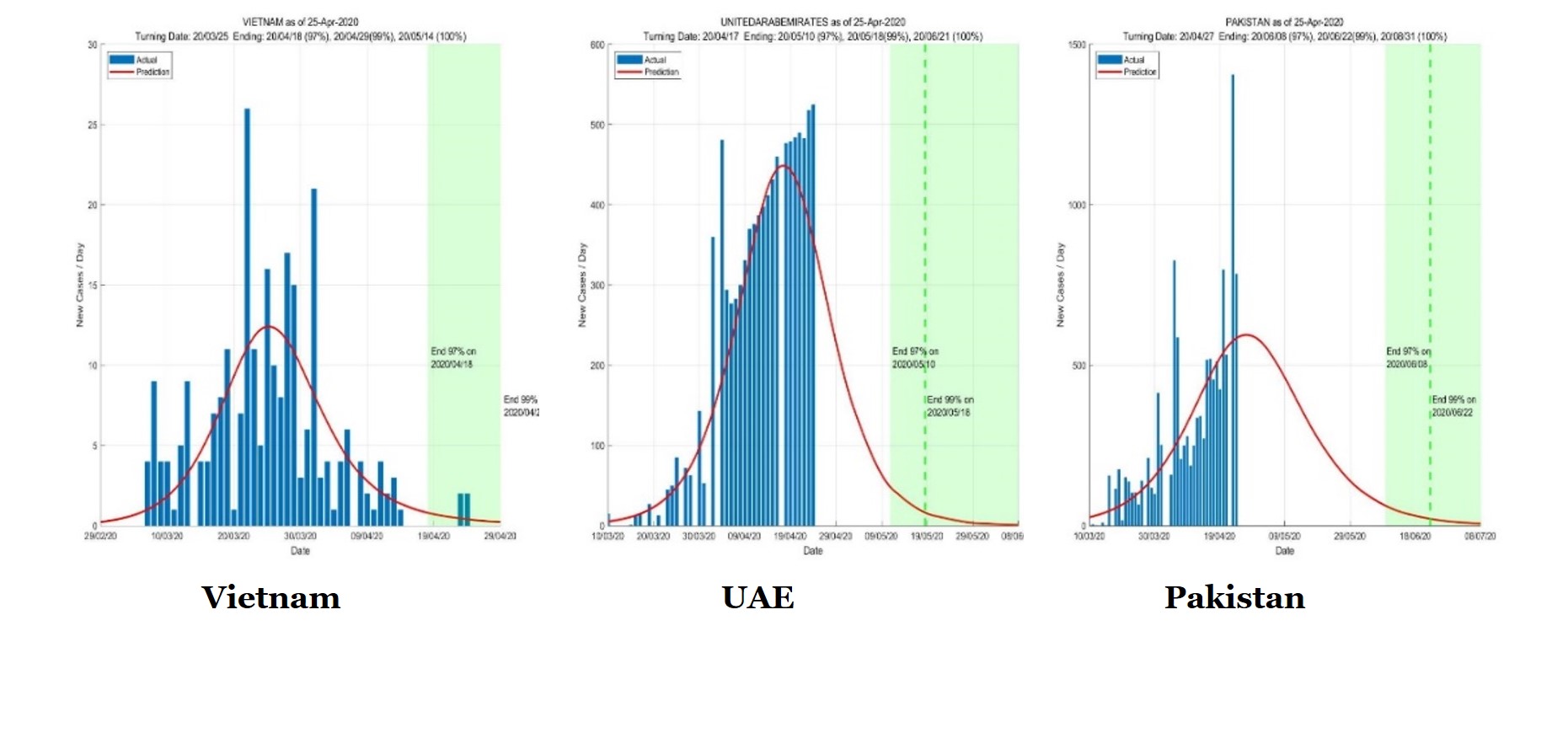 On April 18, Singapore university of Technology and Design launched a webpage (https://ddi.sutd.edu.sg/when-will-covid-19-end/) to share prediction of future developments and end dates of Coronavirus epidemic in different countries. For each country, a simple figure was provided to show estimated pandemic life cycle and ending phase along with the real data or history to date, which consecutively describes the inflection point and ending phase. According to the model estimation based on data as of 25th April 2020, the pandemic in Vietnam has previously gone over its inflection point and is expected to reach its ending phase. According to the SIR model the pandemic in Vietnam is in its ending phase in the last part of April and will possibly end on 15th May 2020, UAE has also already experienced the peak in the number of cases and will be in the ending phase from 11th to 19th May 2020 and the pandemic will probably end on 22nd June 2020 in UAE. According to the model Pakistan has experienced the bend in the cure on 27th April 2020 and 97% of the COVID-19 in the country is expected to end in the mid of June 2020 and the forecast is that the pandemic will end on 1st September 2020 in Pakistan (12).