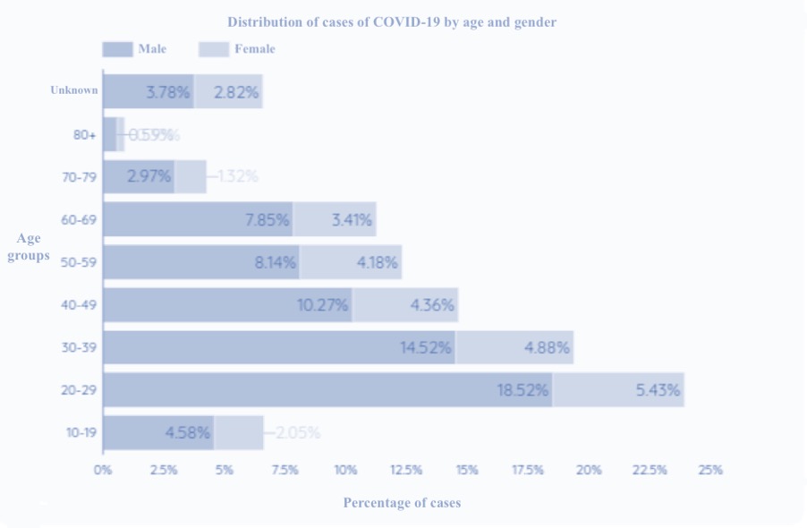 As seen in Figure 5, males constitute a higher percentage of total cases of COVID-19 than females throughout all the age groups. In terms of age distribution, the greatest number of cases are reported among individuals aged 20-29 years, while the age bracket of 80+ years has the lowest number of cases for both males and females.