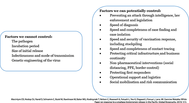 Exercise Mataika enabled cross-sectoral expert input into considering many aspects of a smallpox release and subsequent pandemic. We provide a framework for identifying and focusing on factors potentially within our control along the entire spectrum from pre-attack to recovery, from intelligence, legislation and law enforcement to public health measures and social mobilisation. We recommend that critical weak points be mitigated with prior careful planning, maximising prevention of planned attacks through intelligence gathering, and optimising a timely response and the recovery phase, whilst recognising substantial physical, infrastructure and human resources surge requirements in a pandemic. The exercise also highlighted the importance of international cooperation and the tensions which may arise between this need and domestic responses within each country, especially regarding the WHO pledged vaccine stockpile. Preparedness for a potentially catastrophic epidemic requires an inclusive and collaborative approach with all first response sectors and across nations, rather than a health-centric, localised approach to planning. Traditional planning focuses predominantly on medical counter-measures after an attack has occurred.
