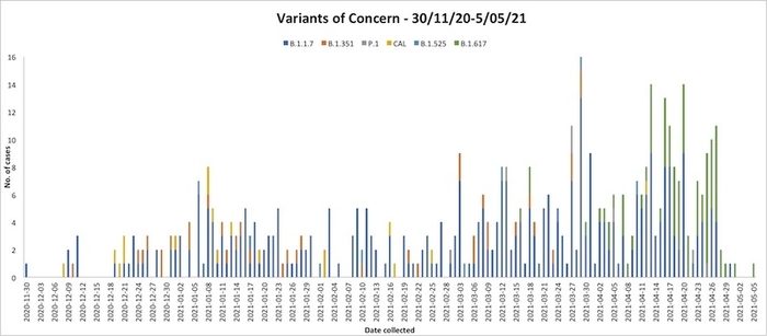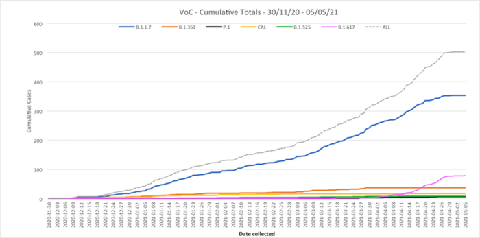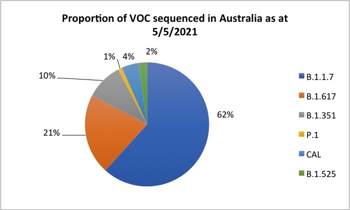| Critical analysis | Variants of concern have been sequenced in Australia after introduction from returned travellers. Tracking the VOC sequences in Australia can contribute actionable decision-making information. Below is a graphical representation of the sequences reported to GISAID between the dates of November 2020 (when the first sequence was recorded in Australia) to 5th May 2021 (3). B.1.1.7 is the most frequently reported (353 sequences) with the number of confirmed cases increasing (3). B. 1.351 n= 37 sequences, P.1 n=7, CAL n=18, B.1.525 n=9, B.1.617 n = 79 (5). Emerging VOC - B.1.617 There is little known about the variant at this time, however it shares key mutations with other VOCs: S:P681R which may enhance transmission by increased receptor binding (5, 86) S:E484Q which is linked to immune escape and risk of re-infection. This mutation is not present in B.1.617.2 (5, 86). S:L452R which is linked to increased transmissibility (5, 86). On the 7th May 2021, Public Health England classified B.1.617.2 as a Variant of Concern, based on evidence that suggests that it is equally as transmissible as B.1.1.7, with rising cases and community transmission occurring in England (86). There is no evidence of more severe disease or decreased vaccine effectiveness at this stage (86). Several countries, including Australia, have imposed bans on travel from India due to escalating case numbers emergence of the new COVID-19 variant B.1.617 (87).