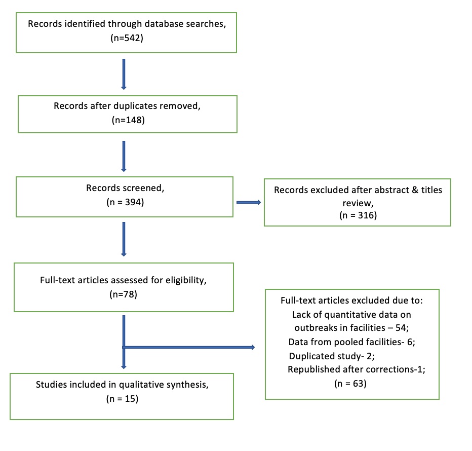 The majority of the studies used Reverse Transcription Polymerase Chain Reaction (RT-PCR) testing of residents (supplementary table S1, reference 1, 4-8, 10-15) and staff (supplementary table S1, reference 2, 6, 7, 13, 14) after the occurrence of an outbreak. In 36.2% (640/1767) of the outbreaks, retesting of all residents or negative residents/staff was conducted (supplementary table S1, reference 1, 4, 6, 7, 13, 10). Some LTCFs instituted either isolation of residents and cohorting of positive cases, or isolation of all residents and exposed ACWs (supplementary table S1, reference 2, 6, 7, 8, 10, 11-13, 15). In the aftermath of an outbreak, most LTCFs recommended RT-PCR testing to identify all infected staff and residents for early isolation (supplementary table S1, reference 1, 3, 4, 6, 9, 11, 12, 14, 15). Six of these facilities also advocated for repeated testing of all residents, irrespective of symptoms (supplementary table S1, reference 1, 4, 6, 7, 10, 13).