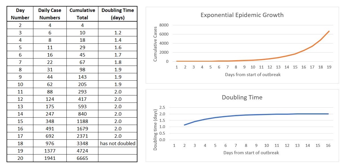 The method involves assessing how long it takes to double the number of recorded infections, as a rolling calculation on successive days. Without interventions in a susceptible population, the doubling time should remain approximately constant, as an outbreak grows. For example, Figure 1 shows case numbers if each 100 infected persons infect (exactly) 141 others (reproduction number 1.41). This leads to a doubling time of 2 days, as shown. Where changes of doubling time are observed, since these do not (usually) represent changes of viral infectiousness, they indicate the success (or failure) of interventions where doubling times increase (or decrease). Worthy of note in Figure 1, even though the reproduction number is held constant in the example, it takes some days for the doubling time to stabilise at its ‘true’ value of 2.0. The early phase estimates are contaminated by the rounding errors associated with small numbers.
