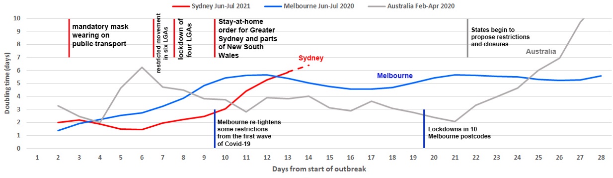 The purpose of this rapid report is to assess how the interventions being applied in Sydney are performing, measured in the relatively objective terms of infection doubling times.