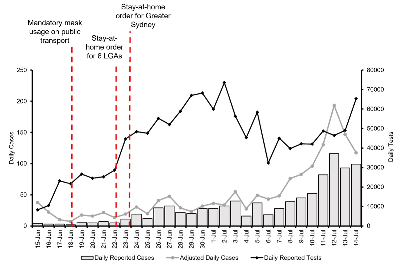 Epicurve of current local reported NSW cases in relation to the number of daily COVID-19 tests performed and adjusted daily cases assuming peak of testing (July 2) captures 95% of the cases in the state.