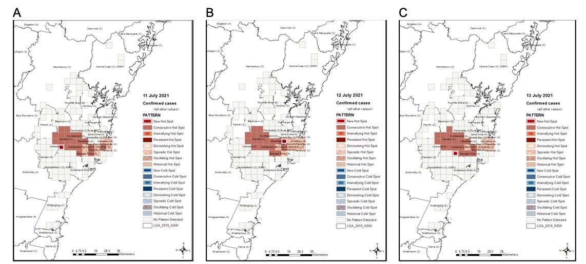 Emerging spatial cluster trends of COVID-19 cases in New South Wales between (A) June 12 to July 11, 2021 (B) June 12 to July 12, 2021 (C) June 12 to July 13, 202.