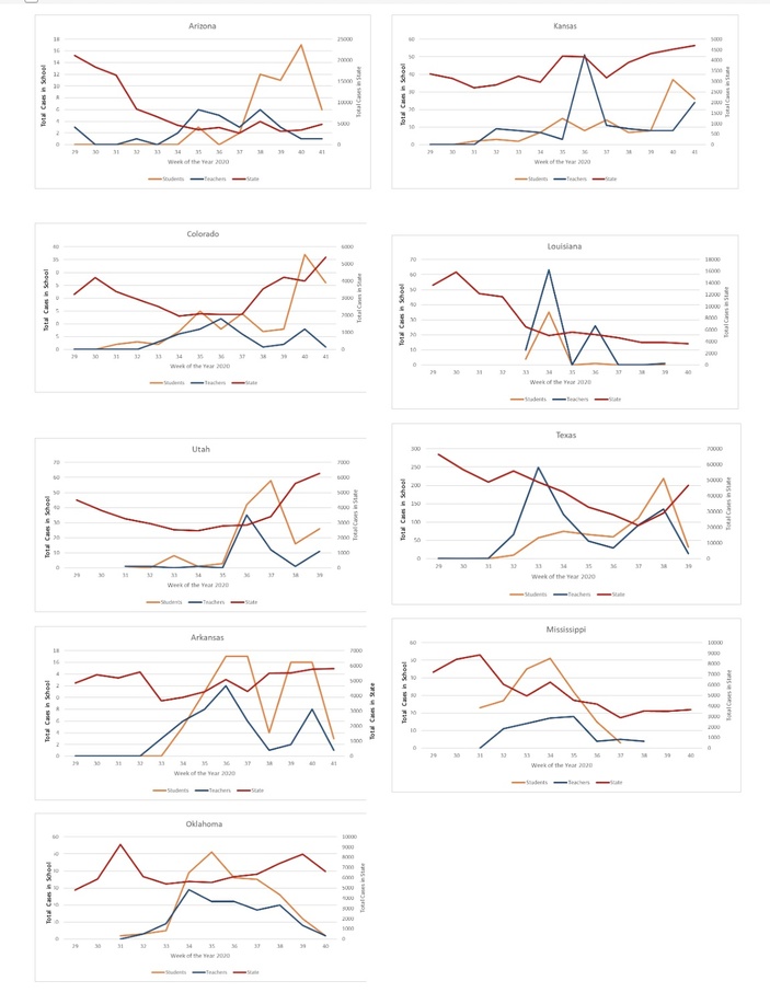Figures 2a-2g show epidemic curves of new cases reported in schools by state superimposed over epicurves of new cases state-wide from data published by CDC (22). The epidemic curves of school outbreaks of most of the states under consideration reflect a propagated outbreak characterised by successive irregular peaks separated by the incubation period. (Figures 2a-2i). Texas, Louisiana, Colorado, Kansas, Arkansas and Arizona show more than one irregular peak, whereas the epidemic curves of Oklahoma, Mississippi and Utah have a single peak.