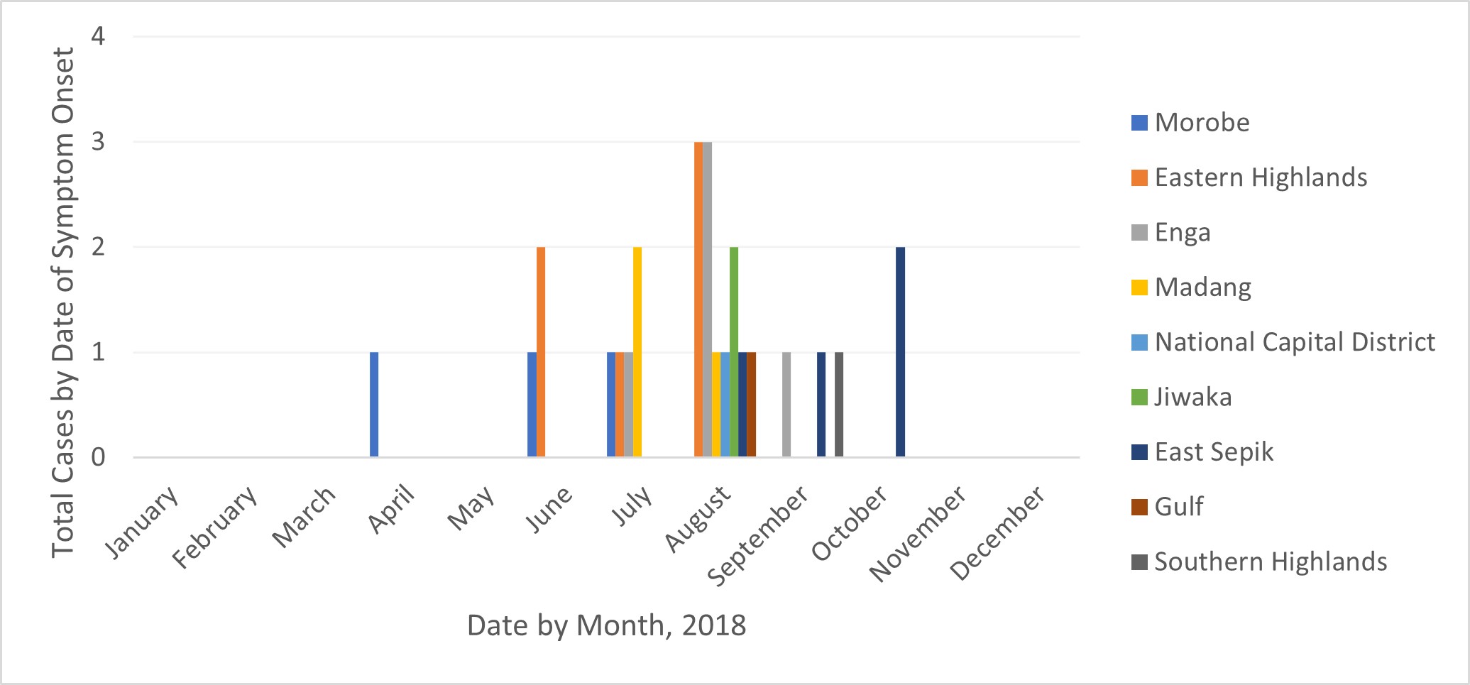 The 2018 cVDPV1 Polio epidemic comprised 26 confirmed cases from nine (41%) of the 22 provinces of PNG. The Eastern Highlands Province recorded the highest number of cases (Figure 1) [15]. Immunization coverage rates were lower in Morobe (where the initial case was identified), and the neighbouring provinces of Madang and Eastern Highlands, when compared to the national rate [20]. This was in part caused by poor health literacy, low socioeconomic status, and poor geographical accessibility [20]. Of the 26 total cases, 19 (73%) were male and seven (27%) were female; 19 (73%) cases were less than 5 years, six (23%) others were from 5 to 14 years while one (4%) was a 17-year-old [2]. Most cases developed onset of AFP symptoms from the month of June 2018, peaking in August 2018 [2]. Figure 2 shows the epidemiological curve of all confirmed cases.