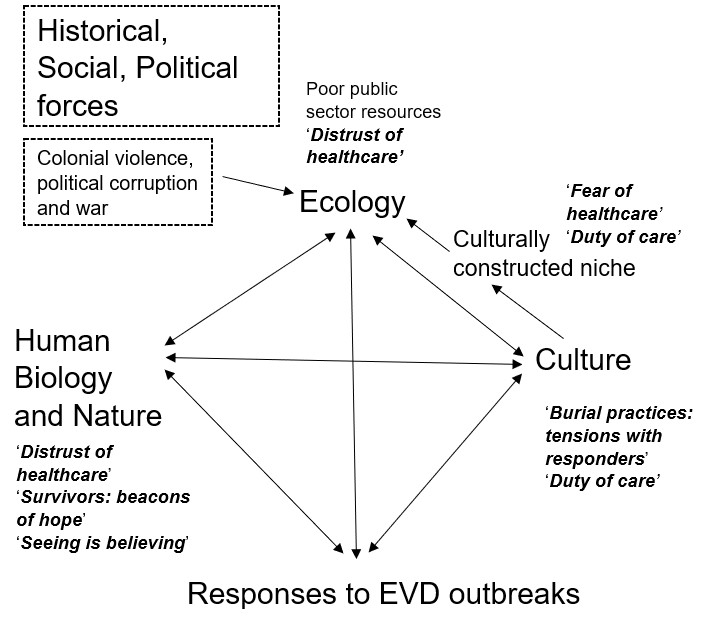 In investigating such an interconnection, it is important to outline a key theoretical paradigm which played a critical role in interpreting our findings. Building from the wider ‘ecological’ wave in public health promotion [9], we decided to adopt Barry Hewlett’s Evolutionary Cultural Anthropology (ECA) approach, which centres on the interconnectivity between social and cultural factors that shape EVD outbreaks [10]. ECA itself consists of a few different components, which include cultural considerations (burial practices), culturally constructed niches (gendered caring roles), ecological factors (proximity to bush-meat) and human biology/nature (fear) [10]. Being a triangulated framework, each component has an interactive role which affects the other factors, ultimately shaping behaviour.