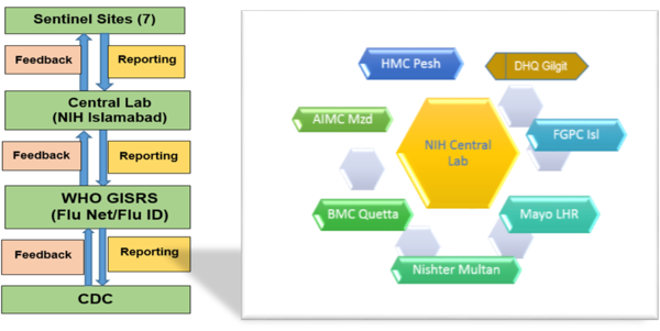Data from all sentinel sites are analyzed at a national reference lab. The system provides data to the country influenza database. All virological and epidemiology data is updated on WHO GISRS website on a weekly basis (Flu Net). The system provides data on risk factors, and thus helps to make strategic decisions on prevention and control of disease. In addition, serial data can show seasonal and yearly trends of influenza. The system also provides support for outbreaks by timely reporting and continuous feedback from the national lab. Major activities of the system include development of surveillance, laboratory protocols and management guidelines, submission of representative/un-typable samples to WHO for vaccine strain selection, capacity building of human resources through training, quality assurance, laboratory management, enhanced biosafety & biosecurity, improved data entry & management capability.