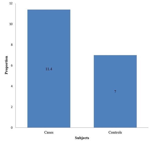 The minimum number of participants required for the study was calculated to be 114. Therefore, 114 cases and 228 controls were recruited for this study. Hence 342 subjects were recruited for this study at a ratio of a case to two controls.