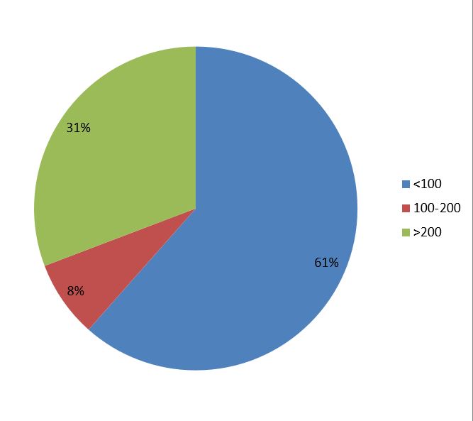 | 101 - 200 | 1 (7.7) | 15 (13.8) |