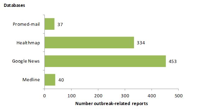 Compared to the total of 453 entries reported in HealthMap, ProMED-mail, and Google News, MEDLINE only published 40 epidemics, which was less than 10% of outbreak reports captured by Internet-based outbreak databases. This means that only a small proportion of epidemic reports are published, highlighting the importance of informal Internet sources of outbreak intelligence.