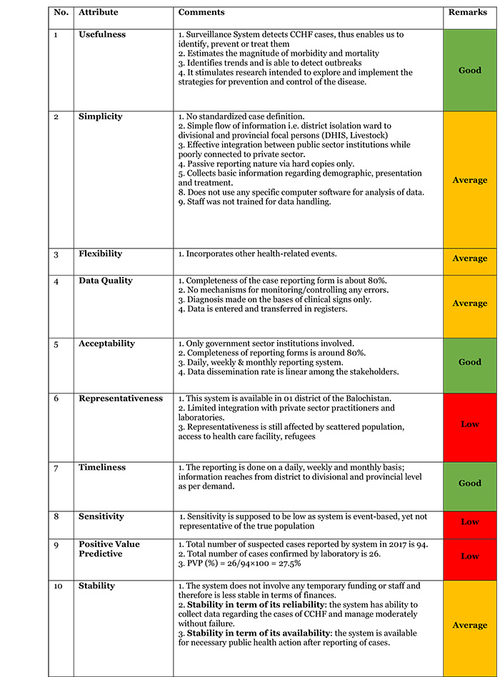 For surveillance system evaluation, system-specific stakeholders were identified. The Medical Superintendent (MS) and Medical Officer (MO) of CCHF isolation ward were contacted by telephone and briefed about the evaluation. Once agreed, the team visited the CCHF isolation ward and verbal consent was taken before an interview from each stakeholder. A detailed semi-structured questionnaire addressing system performance and attributes was developed according to CDC guidelines for public health surveillance system 2001 [13]. Ten attributes (usefulness, simplicity, flexibility, data quality, predictive value positive, sensitivity, timeliness, acceptability, representativeness and stability) were evaluated. The MS, MO, provincial District health information software DHIS program coordinator, Technical Support Officer (TSO) in Provincial Disease Surveillance & Response Unit (PDSRU), provincial CCHF focal person for livestock and the medical technician were interviewed on the flow of information, system assessment and data sharing. The surveillance data provided by the isolation ward of the provincial office and the interview data were reviewed. The system attributes were evaluated quantitatively as well as qualitatively. The grading criteria of the system attributes was described as; Excellent, good, average and poor as shown in Table 1 [14].