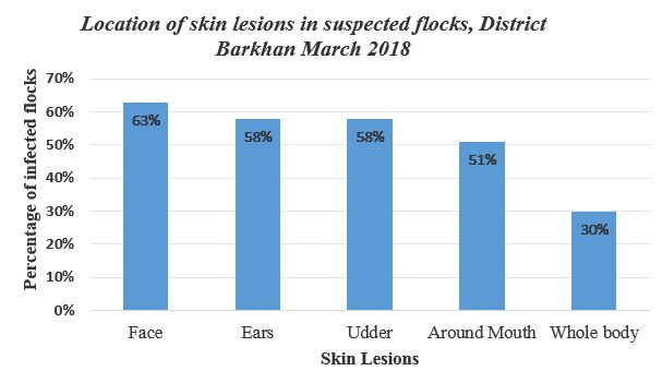 During mid-January 2018, 1500 suspected sheep pox cases were reported by local field veterinarians in the district of Barkhan, Balochistan. The cases presented with skin lesions accompanied by lacrimal & nasal discharge and unusually high mortality. The investigation team was assigned on 28th February to visit District Barkhan to investigate the situation and recommend control measures for future prevention of ongoing outbreak. The district Barkhan has a total sheep population of 413,840 and shares a border with Punjab province. The aim of this investigation was to conduct an outbreak investigation and control the disease through preventive measures to stop further spread of disease.