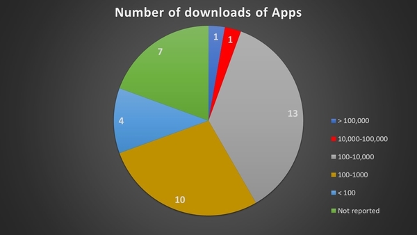 A total of 106 Apps were found in the initial search. Of those, 80 did not meet the selection criteria and were excluded (Figure 1). Finally, 26 relevant surveillance Apps were included in this review, which are summarised in Table 1. Of 26 relevant surveillance Apps, 21 were free of charge and 5 were paid Apps. Of these, 17 Apps are for single disease surveillance, 7 Apps for multiple disease surveillance and 2 Apps provided information on possible bioterrorism agents. The intended user varied from the general public (18 Apps) to health professionals (4 Apps). A further 4 Apps were intended for both the general public and health professionals. Features included real-time tracking using an interactive map (10 Apps), daily notifications (3 Apps), user ability to report diseases/outbreaks (4 Apps), and multiple disease tracking options (7 Apps). The most downloaded Apps were Sickweather with 100,000+ downloads, followed by HealthMap with 10,000+ downloads. Other Apps were far less frequently downloaded (17 Apps have downloads less than 10,000, and number of downloads is not available for seven Apps), and 4 Apps were downloaded less than 100 times (Figure 2). The maximum downloads were of Apps available in the Android platform. Only 4 Apps were available on both Android and iOS platforms, while, 16 Apps were available on the Android platform and 6 Apps in iOS platform.