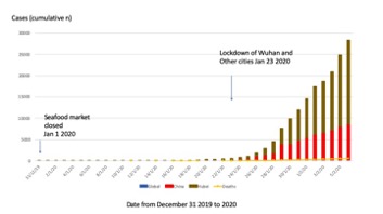 | Unusual features | The source of infection remains unknown, although it arose in the city of Wuhan, Hubei, China. Investigations to determine the source are presumably underway in Wuhan. Reports on January 27th indicate virus has been isolated from samples in the Wuhan seafood market, but no details are available. Transmission appeared to be mainly point-source in the city of Wuhan, particularly linked to a seafood market which also sells other live animals.(1) The market was closed on January 1st but cases surged on January 18th and again on January 24th (see figure 2). There has been confirmed person-to-person spread, but like MERS CoV, most travel related cases imported to other countries have not caused epidemics. However, as the outbreak progressed, fewer cases had direct exposure to the market. The epidemic curve (see figure 2) suggests a surge in transmission after January 20th. This coincides with an increase in travel for Chinese Lunar New Year (Spring festival) celebrations. Most cases in the rest of China have a travel history to Hubei. China took the extraordinary measure of locking down Wuhan and other cities on January 23rd 2020, thereby reducing travel out of the disease epicentre. Given the timing of this epidemic around the Chinese New Year, when travel is at a peak, this would reduce the risk of travel-related importations of cases to other parts of China and the world. On January 27th it was announced that the holiday period was extended for a further three days. The phylogenetic analysis suggests low diversity (ie that the virus is not mutating rapidly, as some media suggests) and a relatively recent origin of the virus from a mammalian source in November or December 2019. However, the initial picture was a point source outbreak followed by a propagated outbreak after January 20th. It is important to compare the phylogenetics of early and more recent cases. Of 500 environmental samples, 35 were positive in the seafood section of the Huanan market. No samples in the wild animal section were positive and no animals have been found to be positive. |
