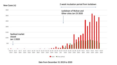 | Did the lockdown work? | Figure 2 shows the epidemic curve (new cases) in Hubei and the rest of China. The lockdown would presumably have reduced the incidence of new cases outside of Hubei in the rest of China, and globally. It may, however, had the opposite effect or no effect in Hubei, due to the high epidemic intensity within the region and apparent sustained transmission unrelated to travel within the region. WHO situation reports provide epidemic curves of cases outside of China only, and show a peak around January 25th, which is consistent with an effect of the travel bans, as many people would have travelled for new year prior to the lockdown on January 23rd. Figure 2 below also shows a flattening of the curve for the rest of China during the 2 week incubation period after January 23rd. This is the period in which new cases may have occurred outside Hubei in people who were incubating infection and left prior to January 23rd. However, the extended New Year holiday will end on February 9th, and another surge in cases may occur around China between February 9-22nd as people who may be incubating infection travel back to their homes after the holidays.