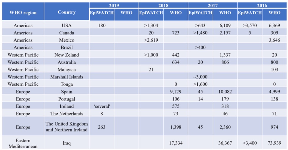 EpiWATCH total reported cases of mumps, by country 2016-2019, compared to WHO total reported cases of mumps, by country 2016-2018 (WHO data last updated 15 July 2019) (34).