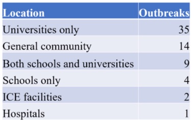 The majority of the reported mumps outbreaks occurred in universities (35 of the 65 outbreaks), followed by the general community (14/65), a combination of primary/high schools + universities (9/65), primary/high schools only (4/65), immigration and customs enforcement (ICE) facilities (2/65), and one outbreak in a Quebec hospital setting (table 3).