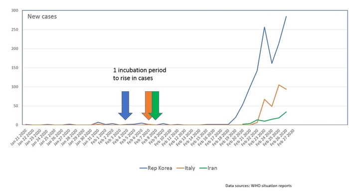 Figure 2 shows the epidemic curves in South Korea, Italy and Iran. Using the incubation period of 2 weeks and working back, it appears that an undetected transmission event may have occurred in South Korea around the 4th of February, in Italy around the 8th of February and in Iran around the 9th of February. In South Korea, 1 case was identified on February 4th, and six more cases in the next two days. It is likely there were other missed, asymptomatic or mildly symptomatic cases in this small cluster, which has given rise to the much larger outbreak evident by February 19th. At this point, enhanced testing and case finding may have identified more cases rapidly. In Italy, there was 1 case reported on February 7th, which may have been associated with other undetected cases or been a super-spreader event. In contrast in Iran, there were no cases reported until February the 20th, which points to the initial transmission event around February the 9th being missed entirely.