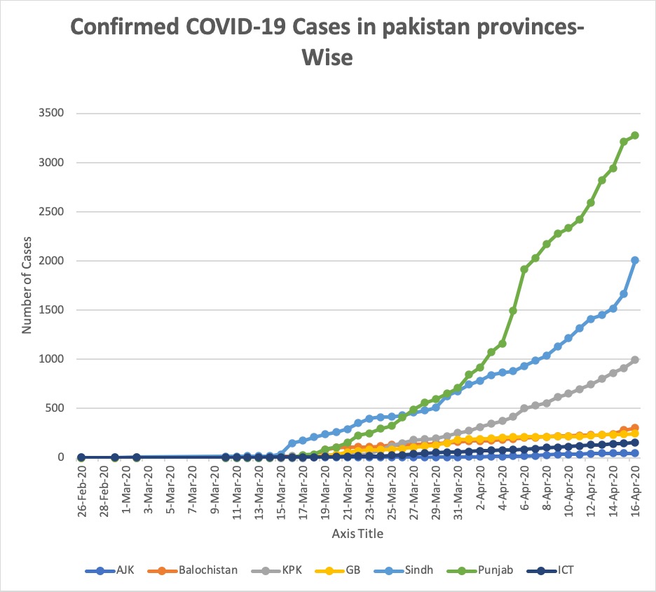Pakistan has recorded its first biggest single-day spike of 134 confirmed cases of coronavirus infections on 17 March 2020, taking the overall tally to 184 (16).This raises concerns on ineffective quarantine procedures as all these cases were from quarantine camps at the country's Taftan border crossing with Iran. So far the highest number of daily cases was 577 cases on 6 April 2020 (17). The graph below (Figure 1) shows details of province-wise confirmed cases to date (17 April 2020).