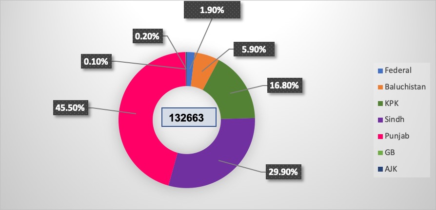 The above mentioned figures are insufficient in portraying the ill capacity of the health system for a population of 212.82 million (30). Another challenge underpinning national preparedness is insufficient human capital- doctors, nurses and paramedics. Augmentation of health care human resources who are at the forefront of the epidemic is required. Engagement of medical students and nurses is needed to increase the capacity of current health staff. The total capacity of the public sector’s hospitals and dispensaries across Pakistan is 132,663 beds, with Punjab having the highest percentage (45%). The figure (Figure 2) is a graphical presentation of percentages of available hospital beds province-wise (31).